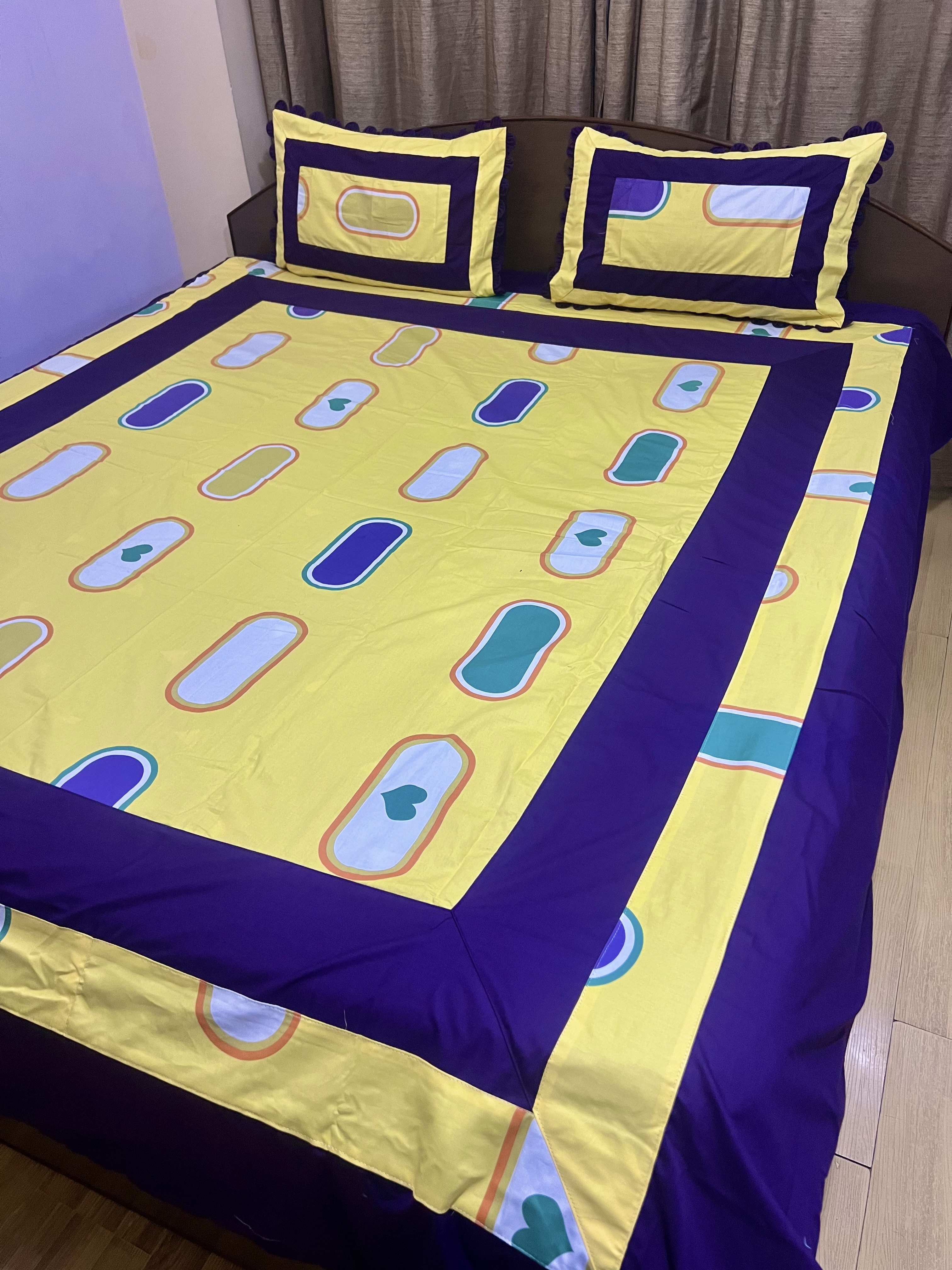 Yellow and Purple Cotton Patchwork Bedsheet with Pillowcase set
